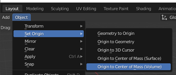 Go to OBJECT > SET ORIGIN > ORIGIN to CENTER of MASS (VOLUME) - (Image 007 - Right Bottom)